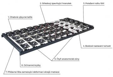Lehací plochu tvoří 55 výkyvných talířů. Konstrukce z pružných talířů výkyvných ve všech směrech zajistí bodové pružení po celé délce i šířce roštu s tisíci podpěrnými body. Přídavná lišta zamezí deformaci okrajů matrace