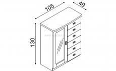 Tato vyšší komoda z řady REBEKA má dvě části, jedna má 6 malých zásuvek, druhou tvoří levá prosklená dvířka (čiré sklo) se třemi poličkami uvnitř. Komoda je vyráběna v rozměrech 49 x 105 x 130 cm.