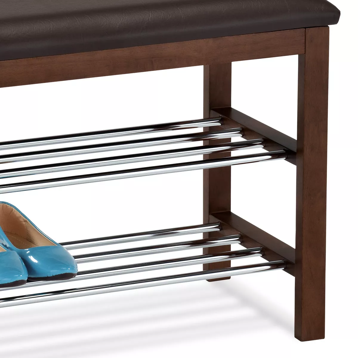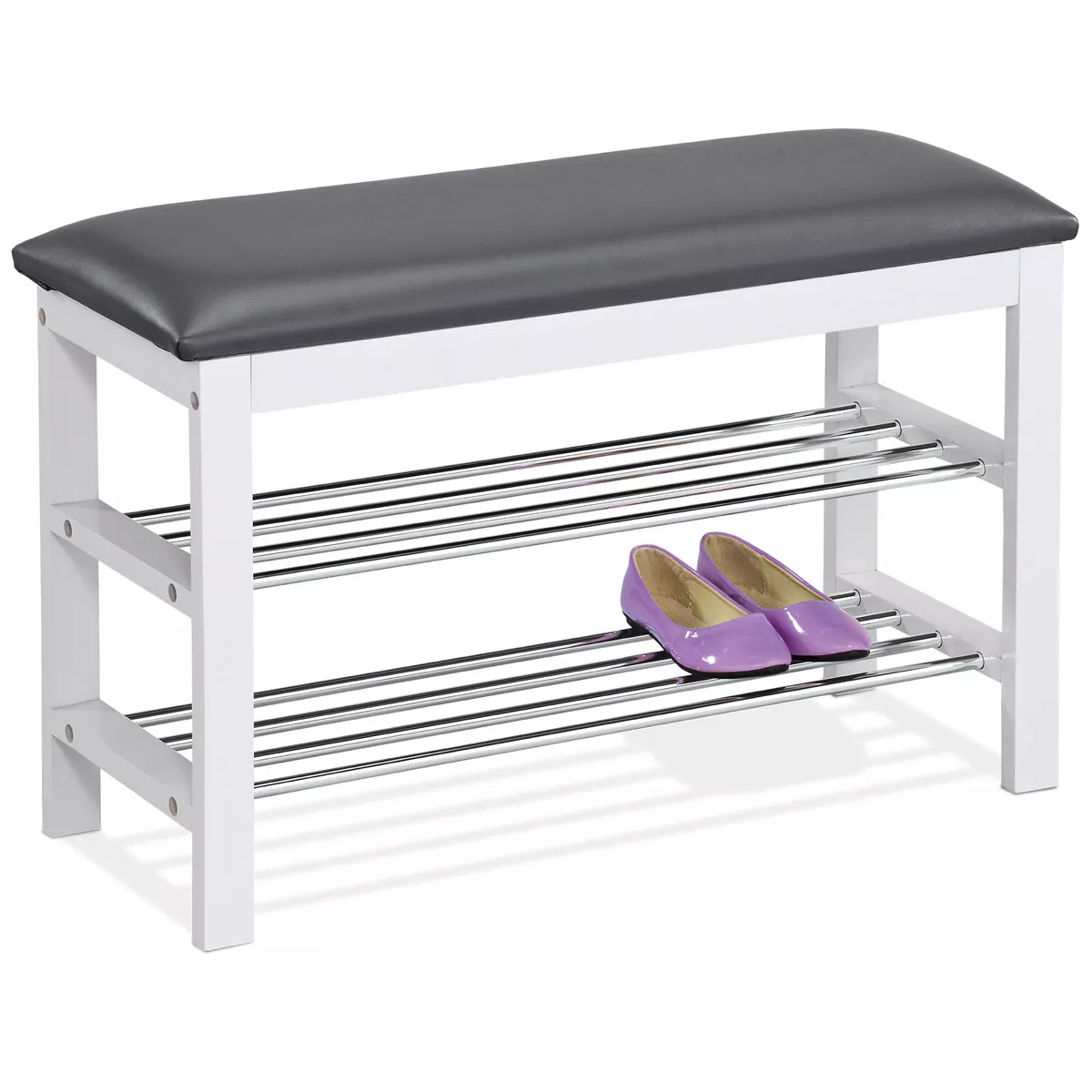 Dřevěný botník 83168-06 namořený do bílé barvy se sedákem v šedé kožence. Tento botník se snadno stane pomocníkem a doplňkem v každém moderním interiéru. Tloušťka chromových trubek je 12 mm. Nosnost sedáku je 80 kg.